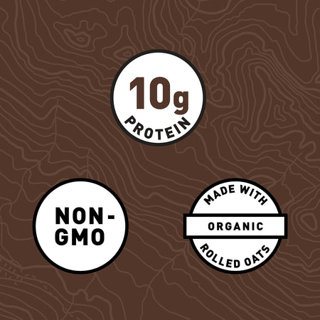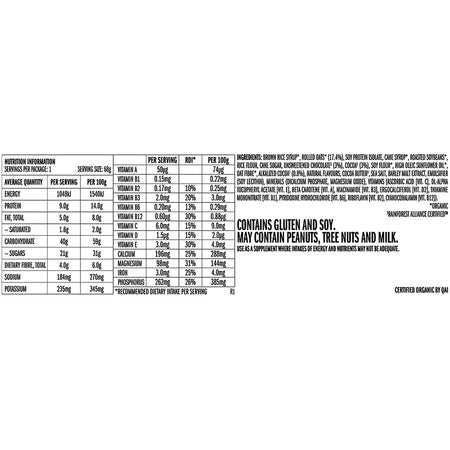 Brown Rice Syrup*, Rolled Oats* (17.4%), Soy Protein Isolate, Cane Syrup*, Roasted Soybeans*, Rice Flour, Cane Sugar, Unsweetened Chocolate‡ (3%), Cocoa‡ (3%), Soy Flour*, High Oleic Sunflower Oil*, Oat Fibre*, Alkalized Cocoa‡ (0.8%), Natural Flavours, Cocoa Butter‡, Sea Salt, Barley Malt Extract, Emulsifier (Soy Lecithin), Minerals (Dicalcium Phosphate, Magnesium Oxide), Vitamins (Ascorbic Acid [Vit. C], DL-Alpha Tocopheryl Acetate [Vit. E], Beta Carotene [Vit. A], Niacinamide [Vit. B3], Ergocalciferol [Vit. D2], Thiamine Mononitrate [Vit. B1], Pyridoxine Hydrochloride [Vit. B6], Riboflavin [Vit. B2], Cyanocobalamin [Vit. B12]). *Organic Ingredients ‡Rainforest Alliance Certified™.CLIF10CPP