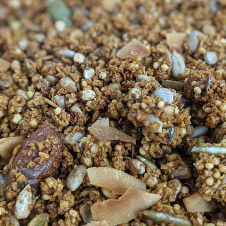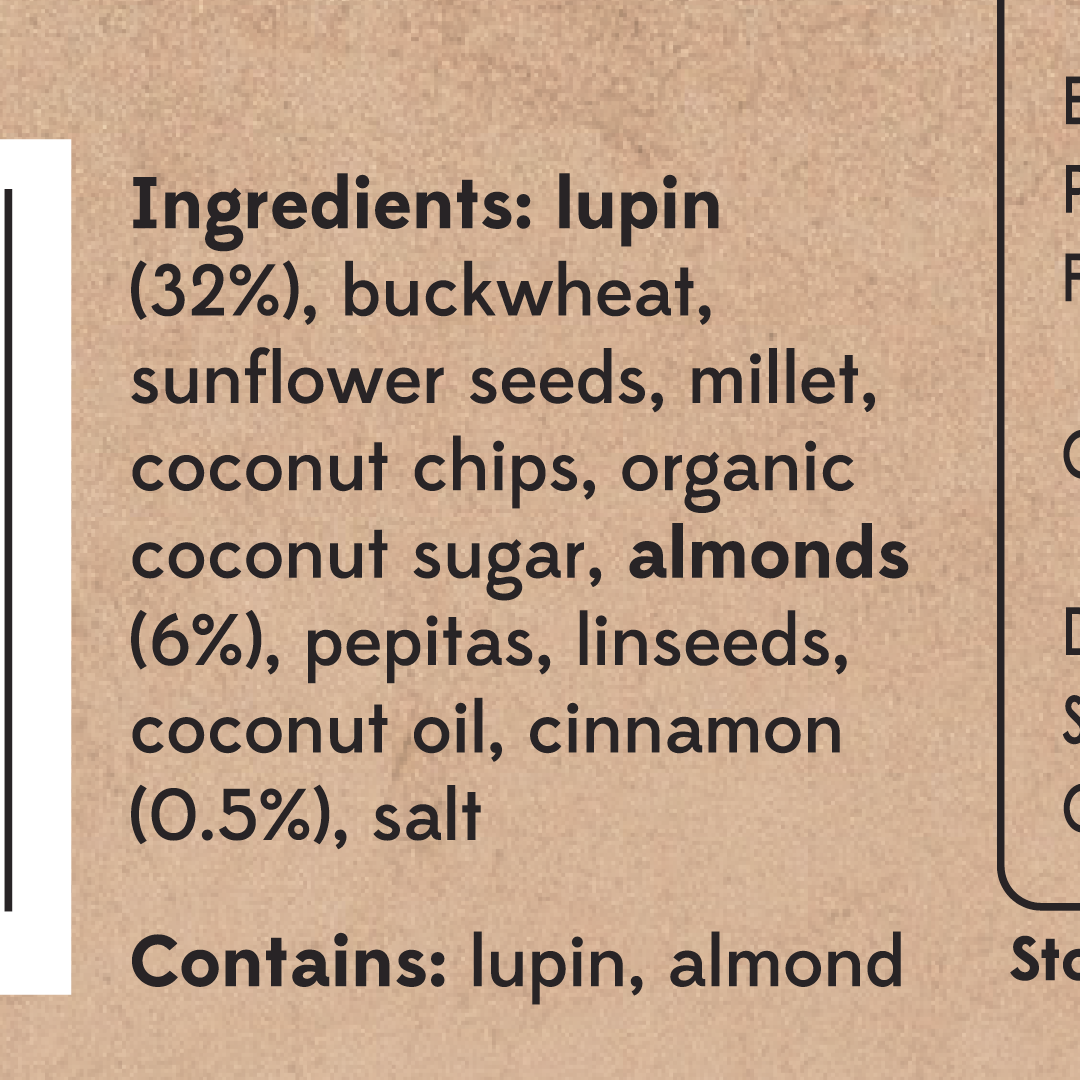 Lupin (32%), Buckwheat, Sunflower Seeds, Millet, Coconut Chips, Organic Coconut Sugar, Almonds (6%), Pepitas, Linseeds, Coconut Oil, Cinnamon (0.5%), Salt.