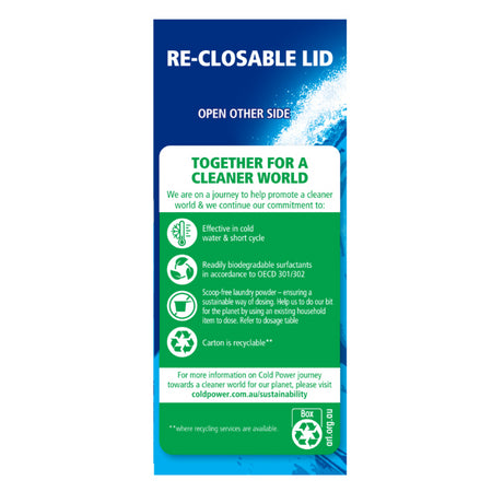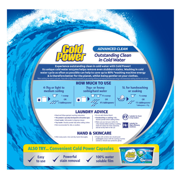 Cold water washing uses less energy, reduces environmental impact and is gentler to your clothes. Cold Power is the smart choice for your laundry! Choose Cold Power Advanced Clean formula for outstanding brightness in cold water washing.