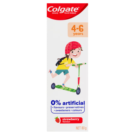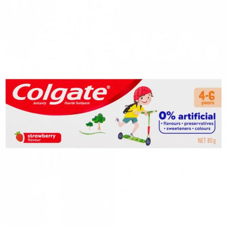 Colgate Anticavity Fluoride Toothpaste for children aged 4-6 years has a fun strawberry flavour and contains 0% artificial flavours, preservatives, sweeteners and colours.
