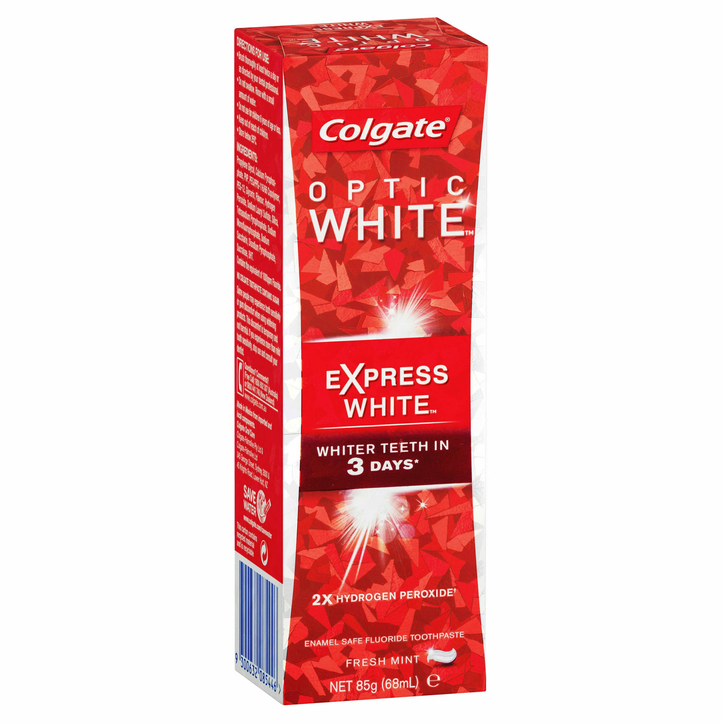 Colgate Optic White Express White whitening toothpaste delivers whiter teeth in 3 days. It is the only toothpaste with the whitening ingredient dentists use to remove surface and deeply set-in stains. The formula contains 2x the Whitening Ingredient, Hydrogen Peroxide. The must-have toothpaste for your daily beauty regime, this whitening toothpaste contains all the benefits of a regular daily use toothpaste plus a whiter, brighter, bolder smile.For best results, use as directed for 4 weeks. Individual results may vary.
