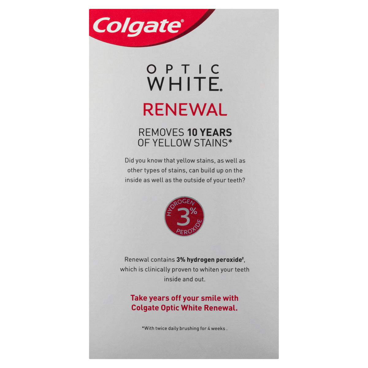 Colgate Optic White Renewal Lasting Fresh Whitening toothpaste with 3% hydrogen peroxide that removes 10 years of yellow stains (With twice-daily brushing for 4 weeks).