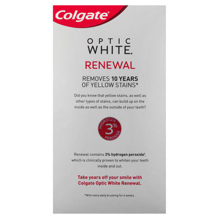 • Colgate Optic White Renewal Lasting Fresh Teeth Whitening Toothpaste REMOVES 10 YEARS OF STAINS TOOTHPASTE.• CONTAINS 3% HYDROGEN PEROXIDE.