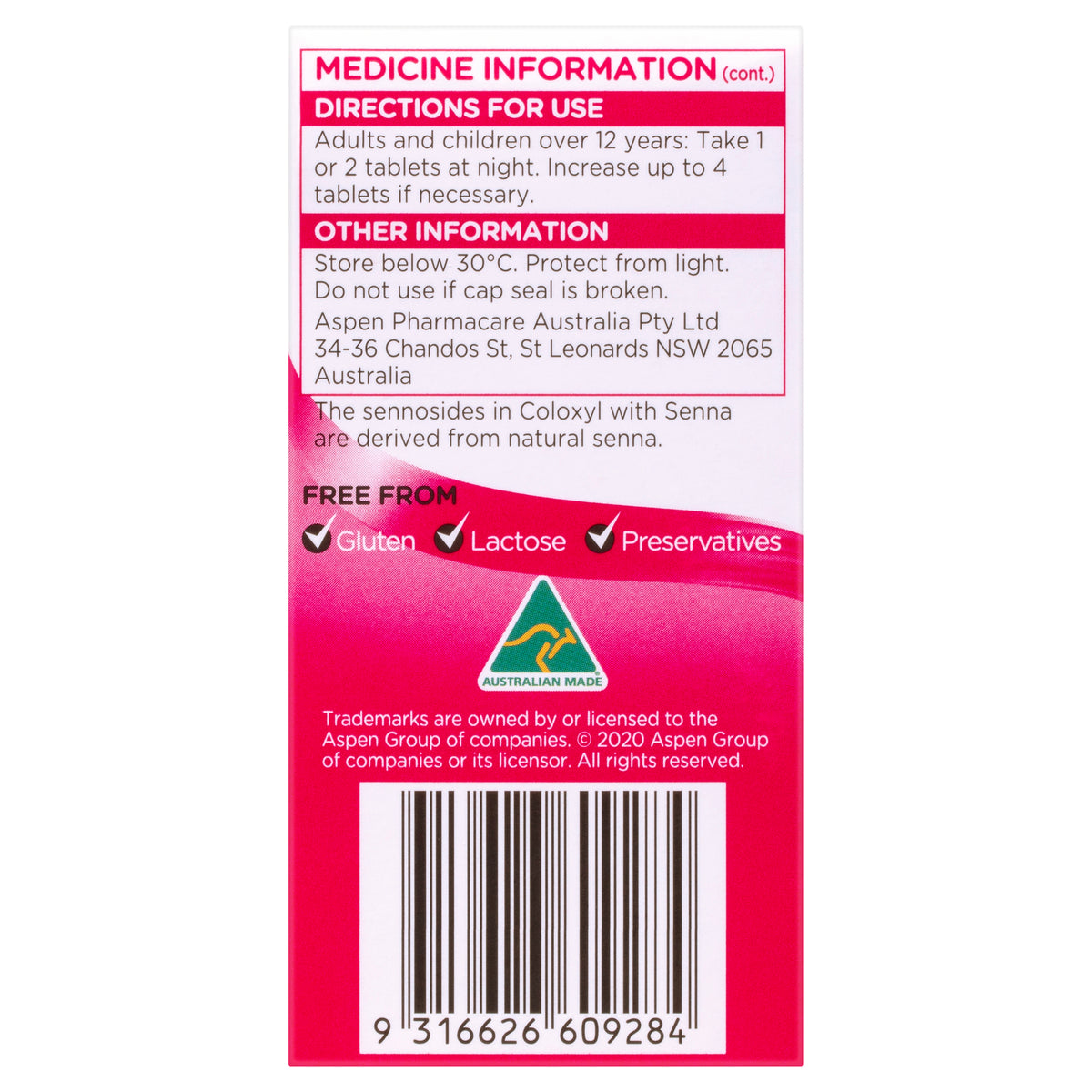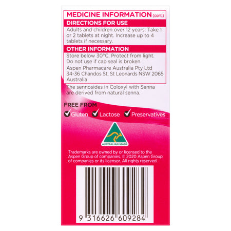 Coloxyl with senna is a dual-action laxative, which provides fast relief from constipation within 6-12 hours. It contains two active ingredients: docusate sodium and senna. Docusate Sodium is a stool softener laxative that works by drawing water into the stool, making it softer, while senna is a laxative that stimulates the bowel to help push the stool out