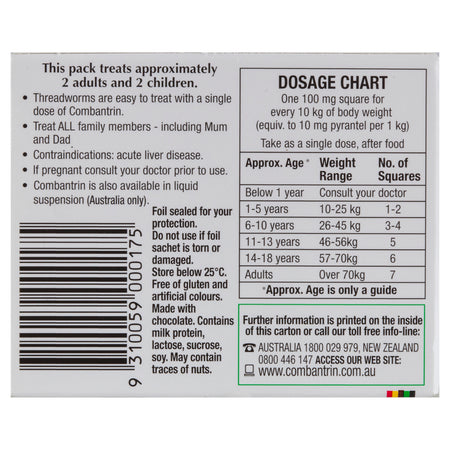 Threadworms, hookworms and roundworms can be easily and effectively treated with Combantrin chocolate squares. Easy to treat with a single dose and suitable for all family members.