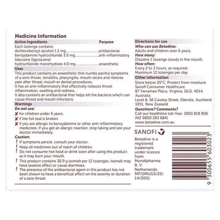 Active Ingredients: Dichlorobenzyl alcohol, enzydamine hydrochloride, lidocaine (lignocaine) hydrochloride monohydrate.