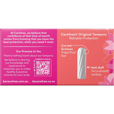 CAREFREE® Original Regular Tampons provide reliable period protection when you need it most. The absorbent unique curved groove design directs fluid efficiently inside the tampon so that you feel better protected against leaks. Plus, the Anti-Fluff technology gives you a smooth surface so that you don't have to stress about fluff.