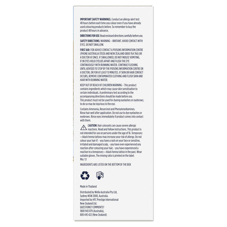 Read and follow instructions on enclosed leaflet. Can cause an allergic reaction - follow the safety instructions. Follow safety instructions perform allergy alert test 48 hours before colouring. Important safety warnings. Conduct an allergy alert test 48 hours before each time you colour even if you have already used colouring products before. So remember to buy the product 48 hours in advance.Do not swallow. For external use only.