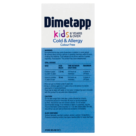 Dimetapp Cold & Allergy Kids 6 Years & Over Colour Free with great tasting, sugar free relief from cold and allergy symptoms.