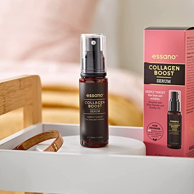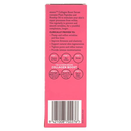 essano Collagen Boost Serum contains Plant Peptides and Rosehip Oil to stimulate your skin's repair processes from within. Use regularly to prevent and smooth wrinkles, for a youthful complexion. These ingredients are clinically proven to: • Plump and soften wrinkles and fine lines • Improve firmness and elasticity • Support natural skin regeneration • Tighten pores and refine texture • Provide intense moisturisation