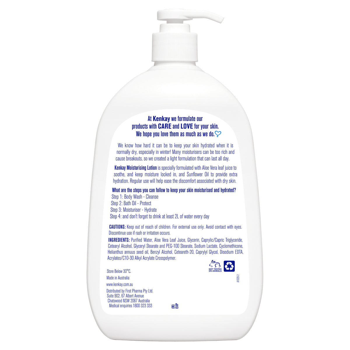Kenkay Moisturising Lotion is specially formulated with Aloe Vera leaf juice to soothe, and keep moisture locked in, and Sunflower Oil to provide extra hydration. Regular use will help ease the discomfort associated with dry skin.