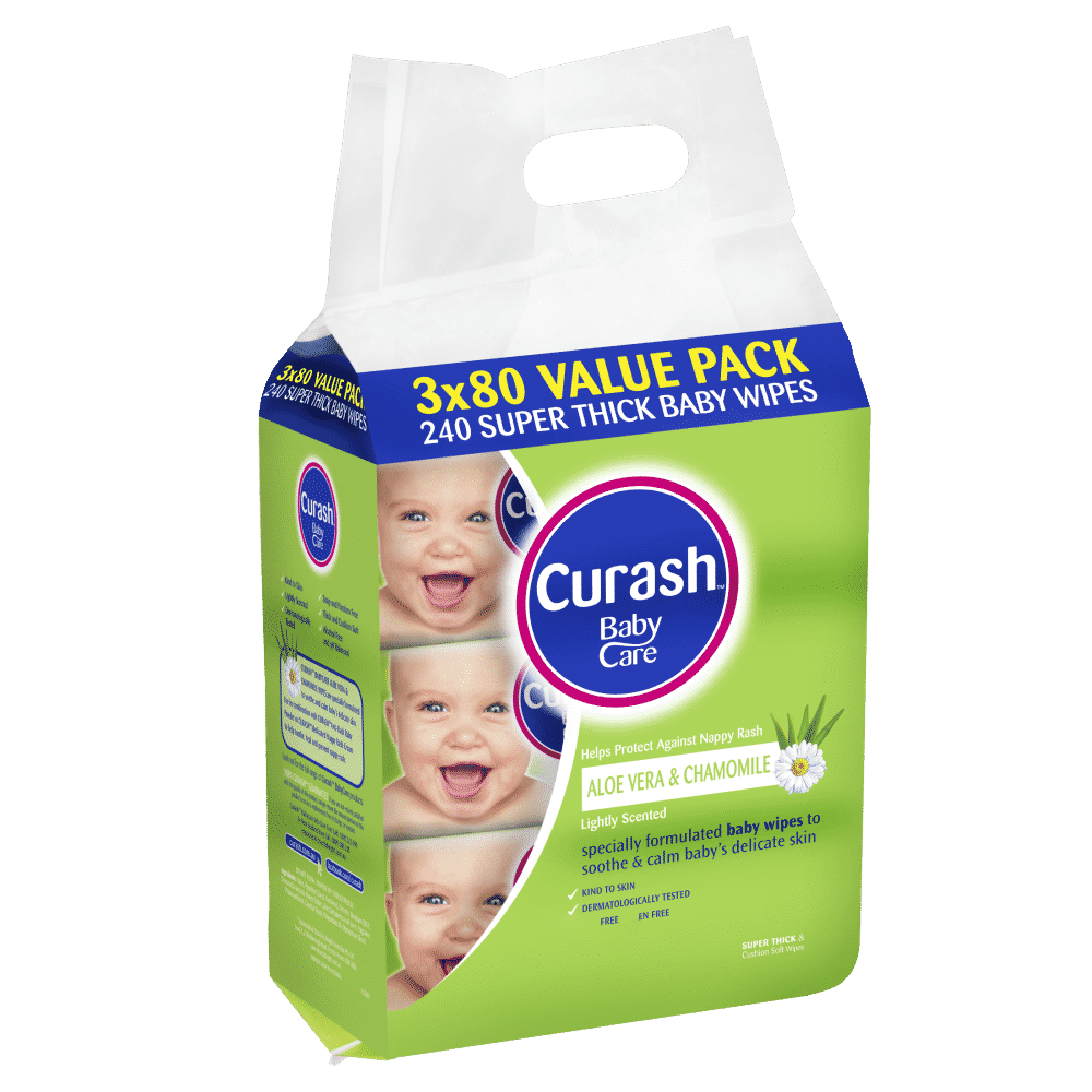Curash™ Babycare Aloe Vera & Chamomile Baby Wipes are lightly scented and specially formulated wipes to soothe & calm babies delicate skin. Value Pack contains 3x80s packs or 240 wipes.