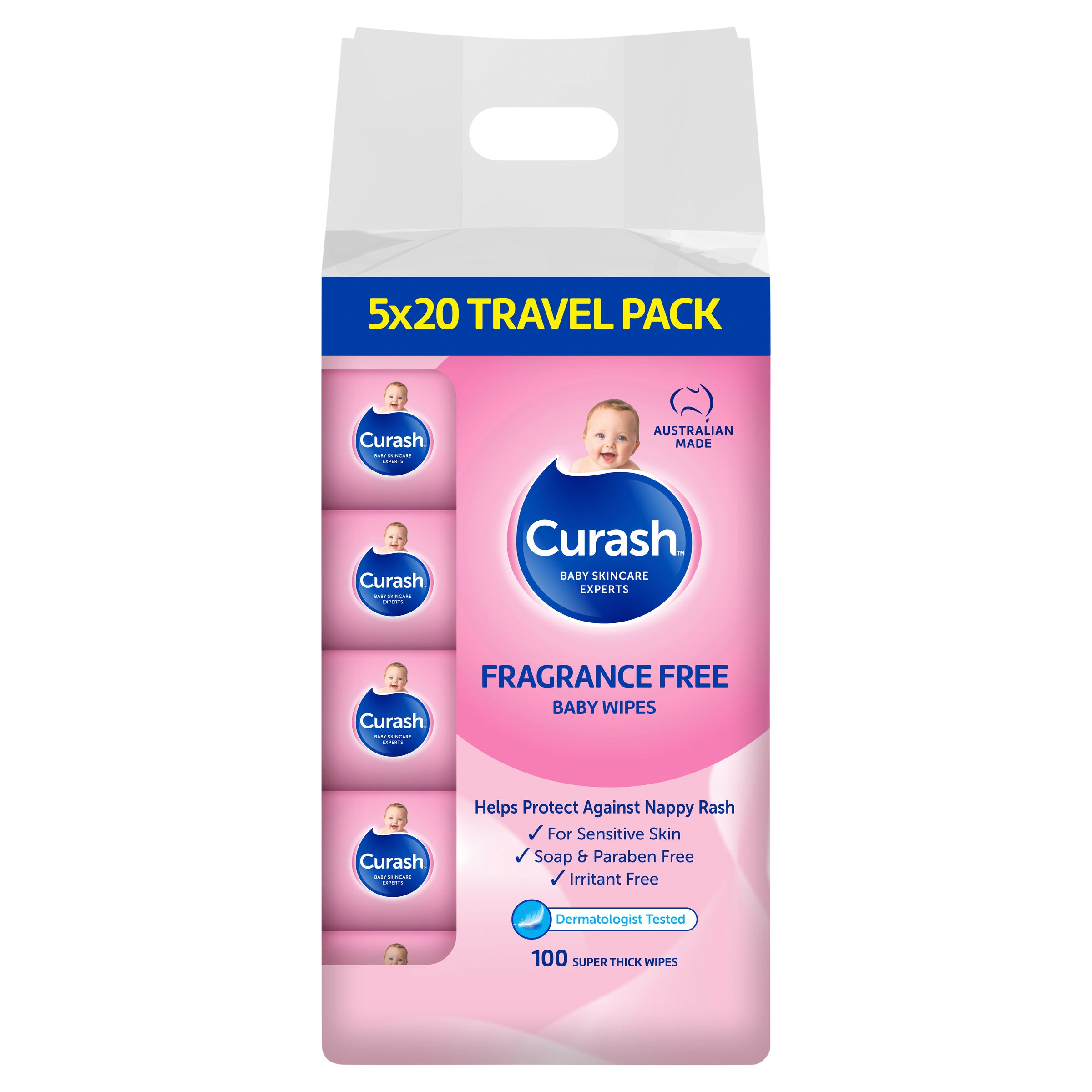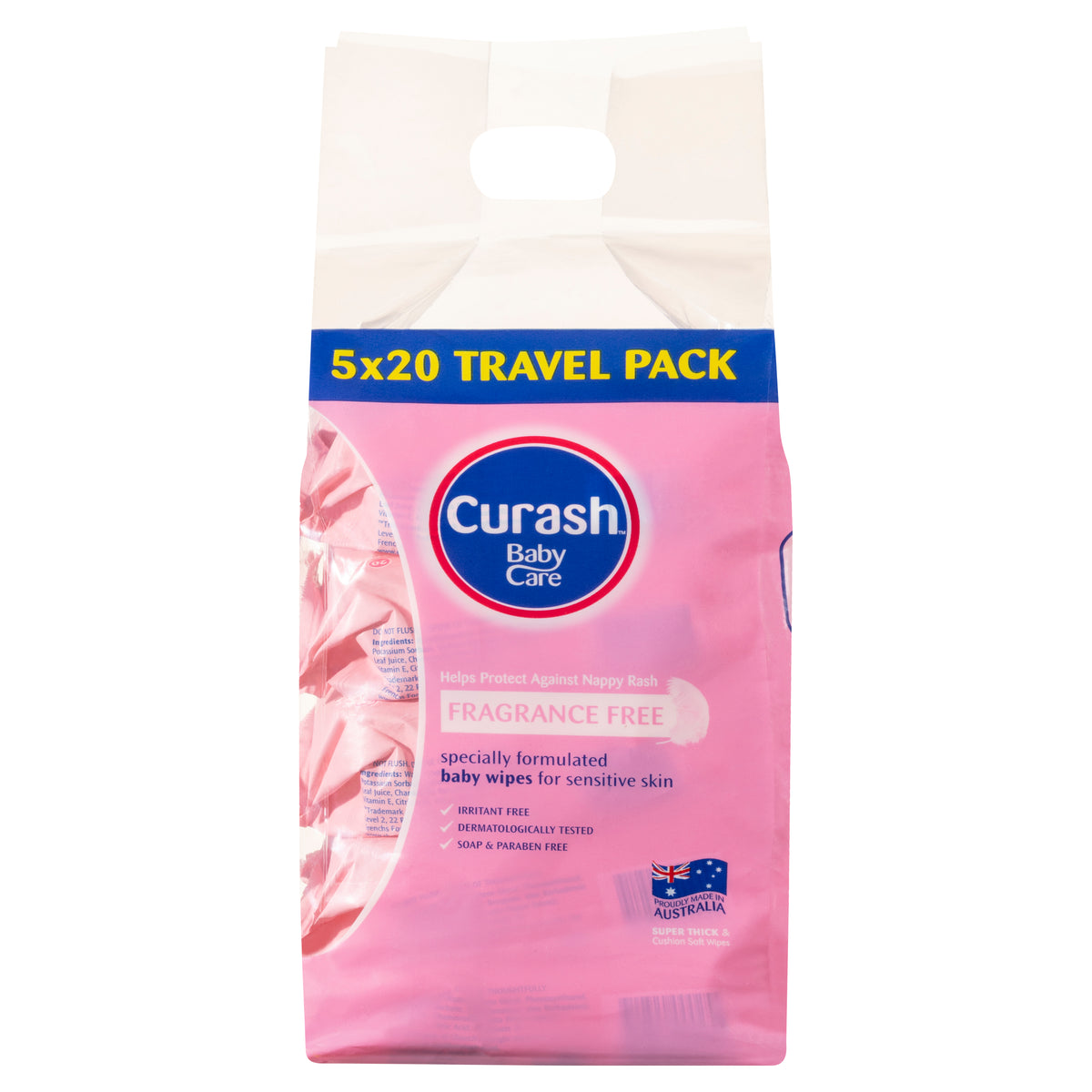 Curash™ Babycare Fragrance Free baby wipes gently cleanse baby's skin and help protect against nappy rash. Travel Size 5 x 20 Pack.