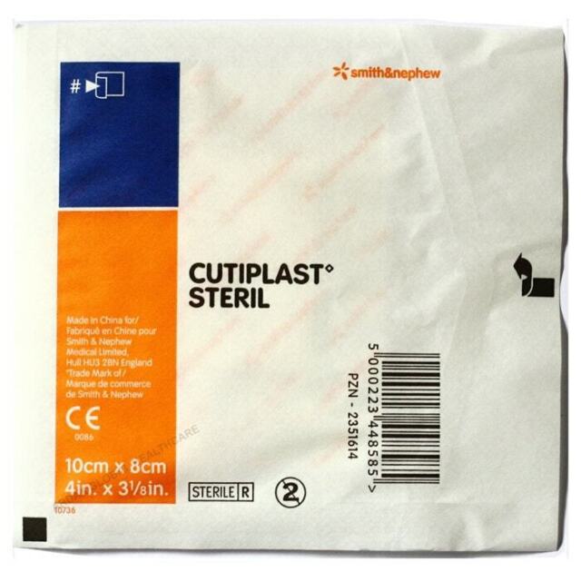 Cutiplast Steril is a soft conformable sterile island dressing especially useful in areas of curvature and flexion such as knees and elbows, hirsute areas and in situations of high humidity as the porous material breathes. Consists of a non-lint low adherent wound pad covered with hypoallergenic Fixomull.