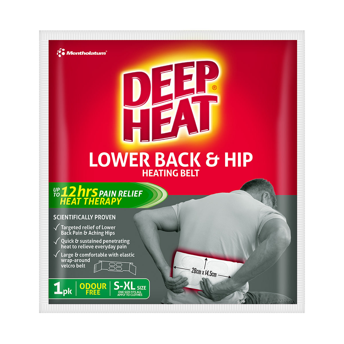 Deep Heat Lower Back and Hip Heating Belt provides up to 12 hours Pain Relief Heat Therapy for relief of Lower Back Pain and Aching hips. The belt is large and comfortable with an elastic wrap-around dressing with velcro.