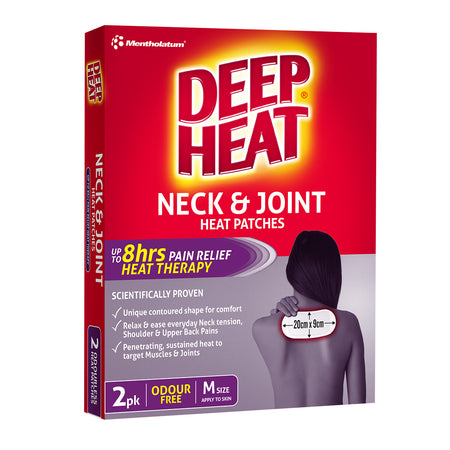 Deep Heat Neck and Joint Heat Patches provide up to 8 hours of targeted, sustained, soothing temporary pain relief of Back Pain, Muscular Aches and Pain, Joint Stiffness, Strains and Sprains. Comfortable to wear, this odourless heat patch applies directly to the skin and can be worn unnoticed under clothing to provide all day relief.