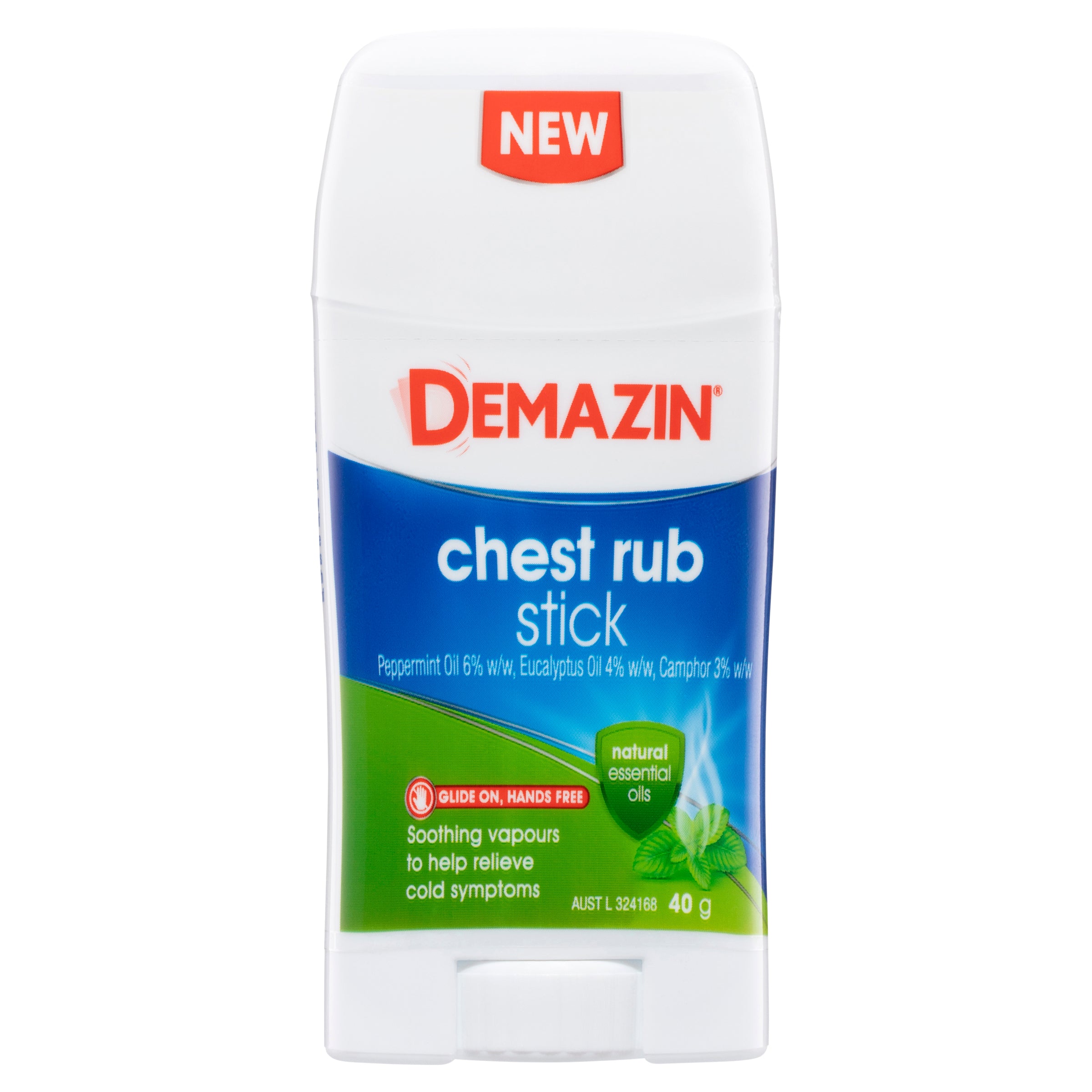 Demazin Chest Rub Stick is a glide on, hands free format with soothing vapours to help calm the chest, and relieve nasal congestion, symptoms of colds and minor headaches.
