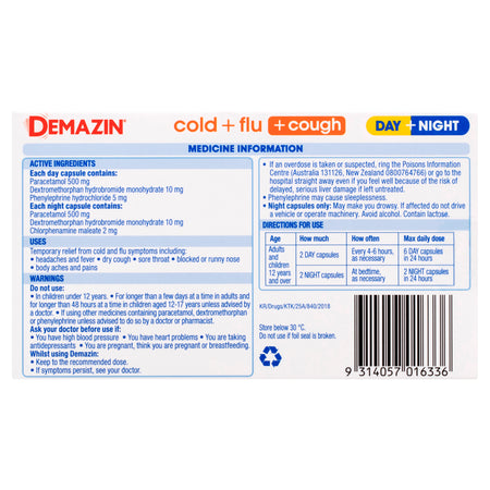 Demazin Cold + Flu + Cough Day + Night - effective temporary relief from cold & flu symptoms including headaches and fever, sore throat, body aches and pains, blocked or runny nose, dry cough.