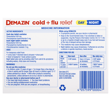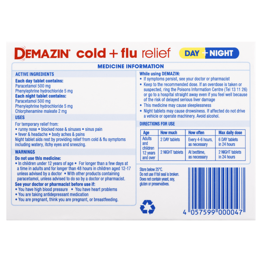 Demazin Cold & Flu Relief provides temporary multi-action relief from blocked or runny nose, sinus pain, fever, headache, and body aches.