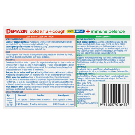 Adults & children 12 years and over: Take 1 capsule daily with food. Take your daily Immune Defence capsule with your first Demazin Cold & Flu + Cough Day capsule dose.