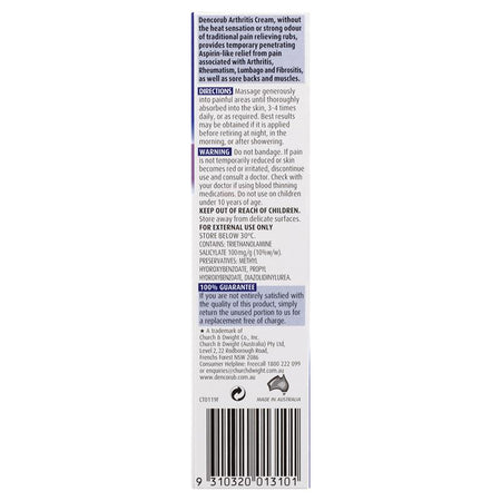 Dencorub Arthritis Cream contains active ingredient Triethanolamine Salicylate (10%). Don't want to take that sporty smell to the office? Dencorub Arthritis Cream is also ideal to help provide temporary relief from general muscle aches and pains without odour or heat of other traditional heat creams and gels.