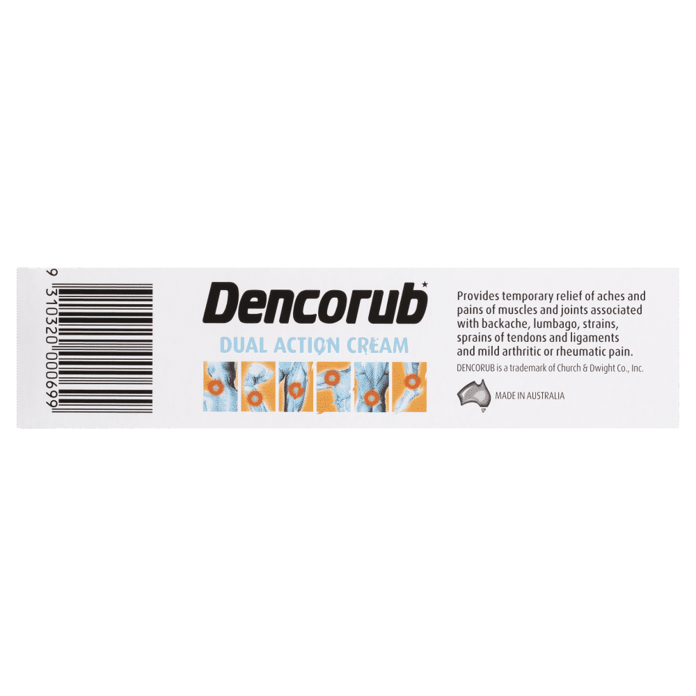 Dencorub Dual Action Pain Relieving Cream begins to work on contact. Specially formulated it goes on feeling COLD TO EASE THE PAIN, then HEATS UP FOR SOOTHING TEMPORARY RELIEF of aches and pains of muscles and joints.