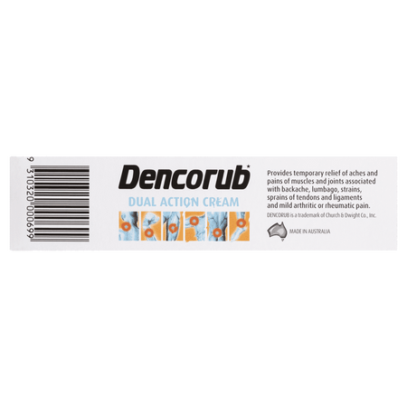 DENCORUB DUAL ACTION CREAM is a non-greasy, quickly absorbed cream that rubs right in and goes right to work providing soothing relief. Specially formulated, it begins to work on contact. The cream goes on feeling COLD TO EASE THE PAIN, then HEATS UP FOR SOOTHING RELIEF. Ideal for temporary relief of aches and pains of muscles and joints associated with backache, strains, sprains of tendons and ligaments.