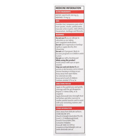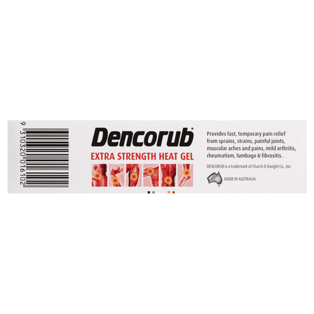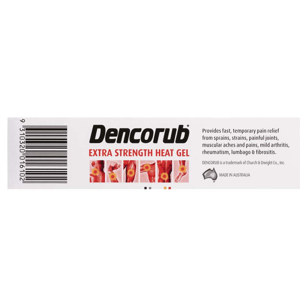 Dencorub Extra Strength Heat Gel's concentrated hot formula provides fast, temporary pain relief from sprains, strains, painful joints, muscular aches and pains.