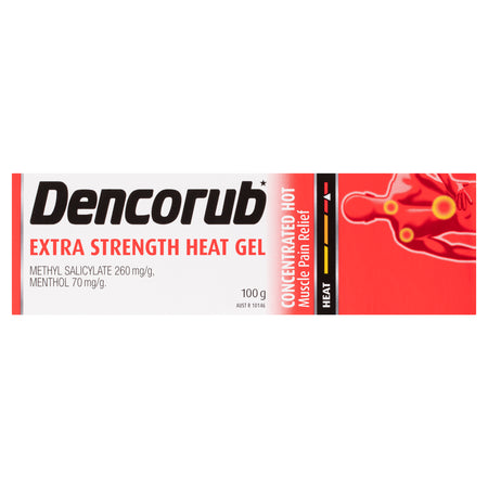 Dencorub Extra Strength Heat Gel contains 26% methyl salicylate, which makes it a concentrated hot formula that gives hours of relief from pain resulting from sprains, strains, painful joints, muscular aches and pains, as well as Arthritis, Rheumatism, Lumbago and Fibrositis. The clear gel formulation allows for faster penetration and relief.