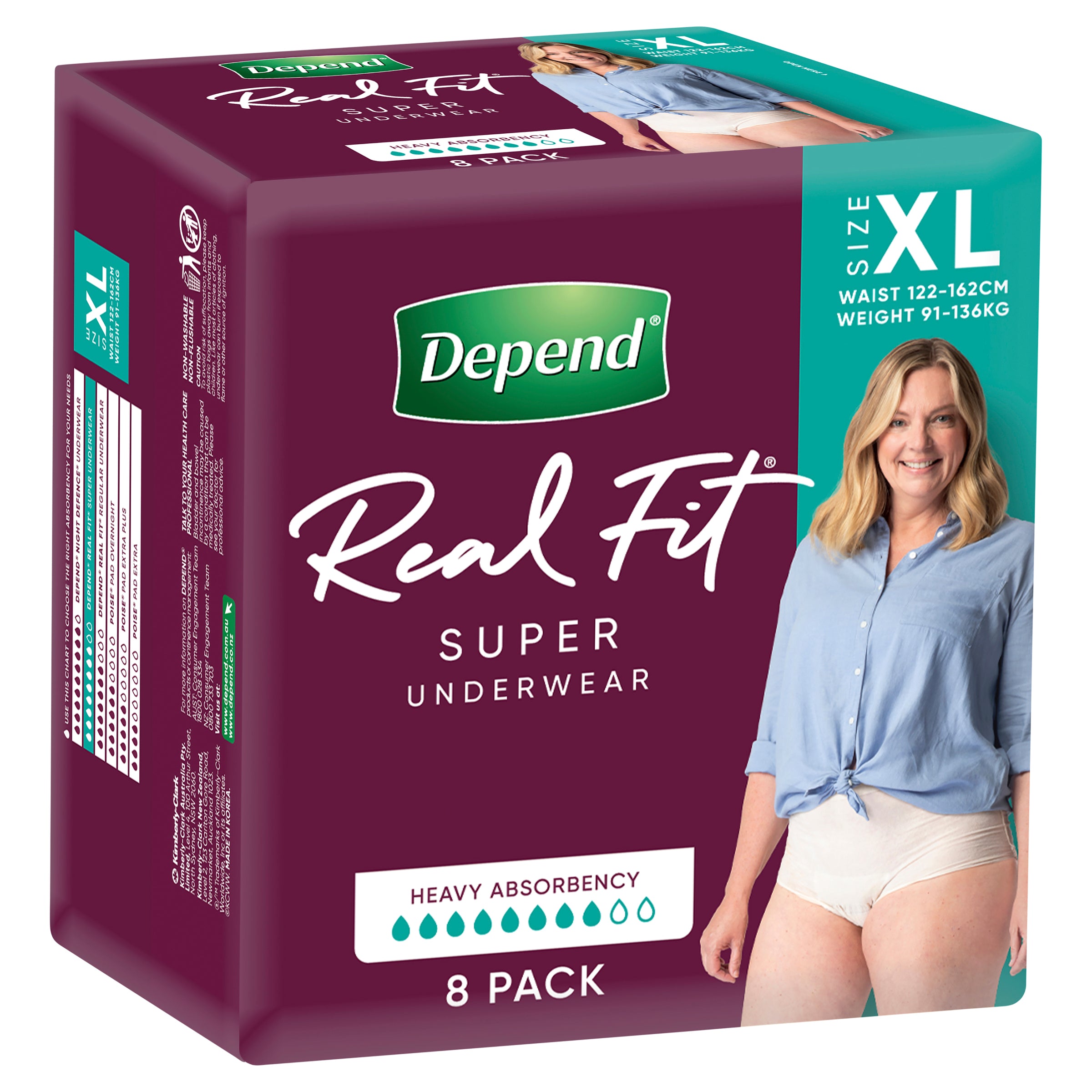 Depend® Real-Fit Super Underwear for Women is specifically designed to fit and feel like real underwear and protect against heavy loss of bladder control. Depend® incontinence underwear is soft, discreet and breathable making it very comfortable to wear. It is 60% more absorbent than regular Real-Fit underwear making it ideal for overnight protection.