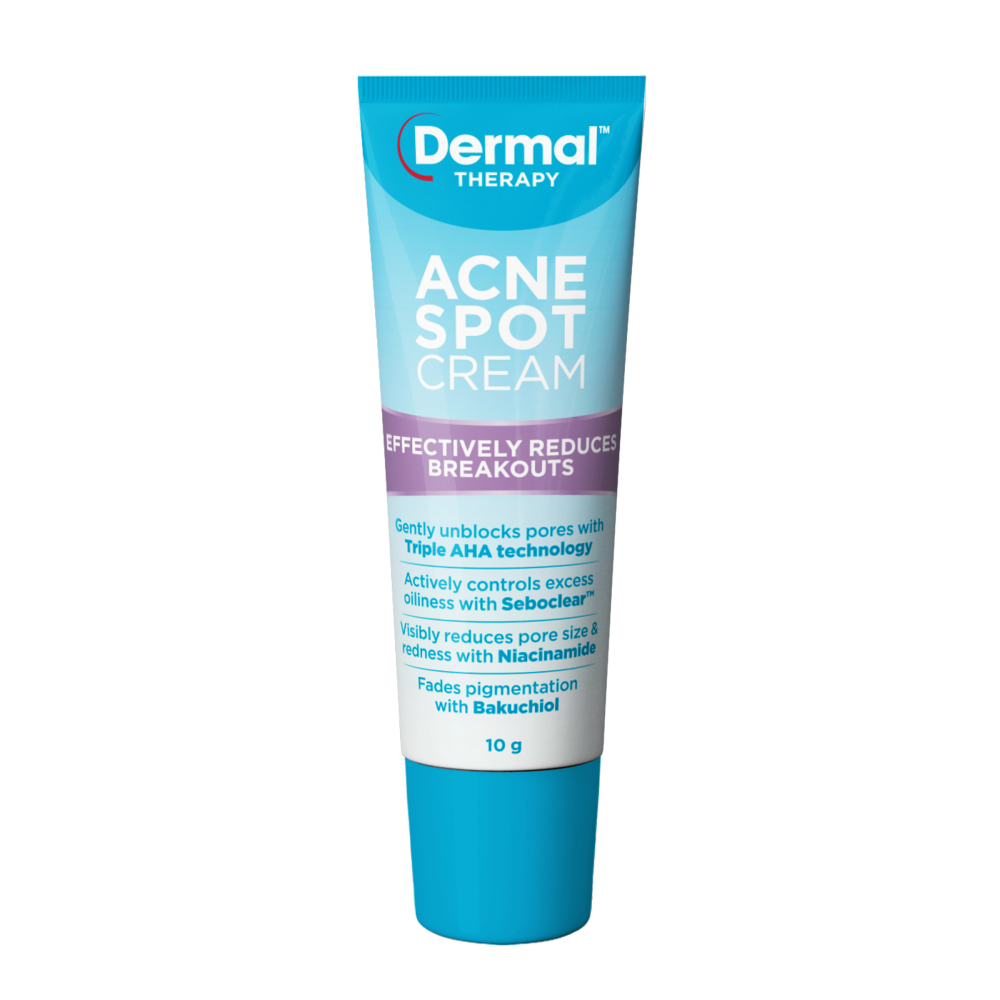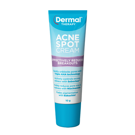 - Treat with Dermal Therapy Acne Spot Cream, a targeted spot treatment formulated with a unique blend of ingredients to effectively reduce breakouts. Also designed with an innovative anti-scar formula, it contains Niacinamide to visibly reduce pore size & redness, as well as Bakuchiol to fade pigmentation.