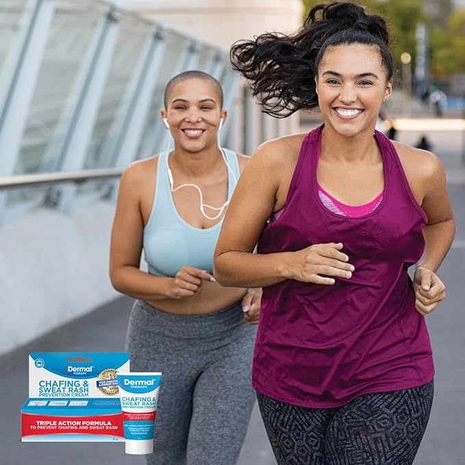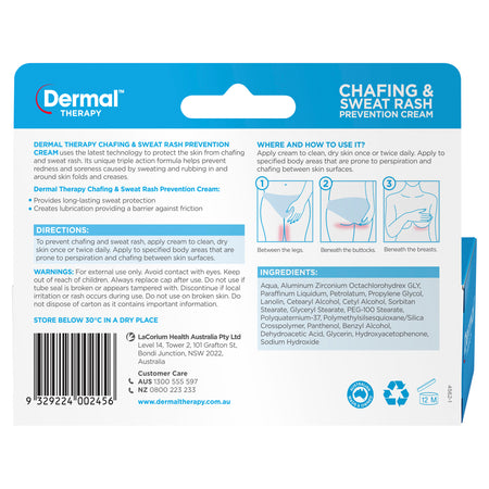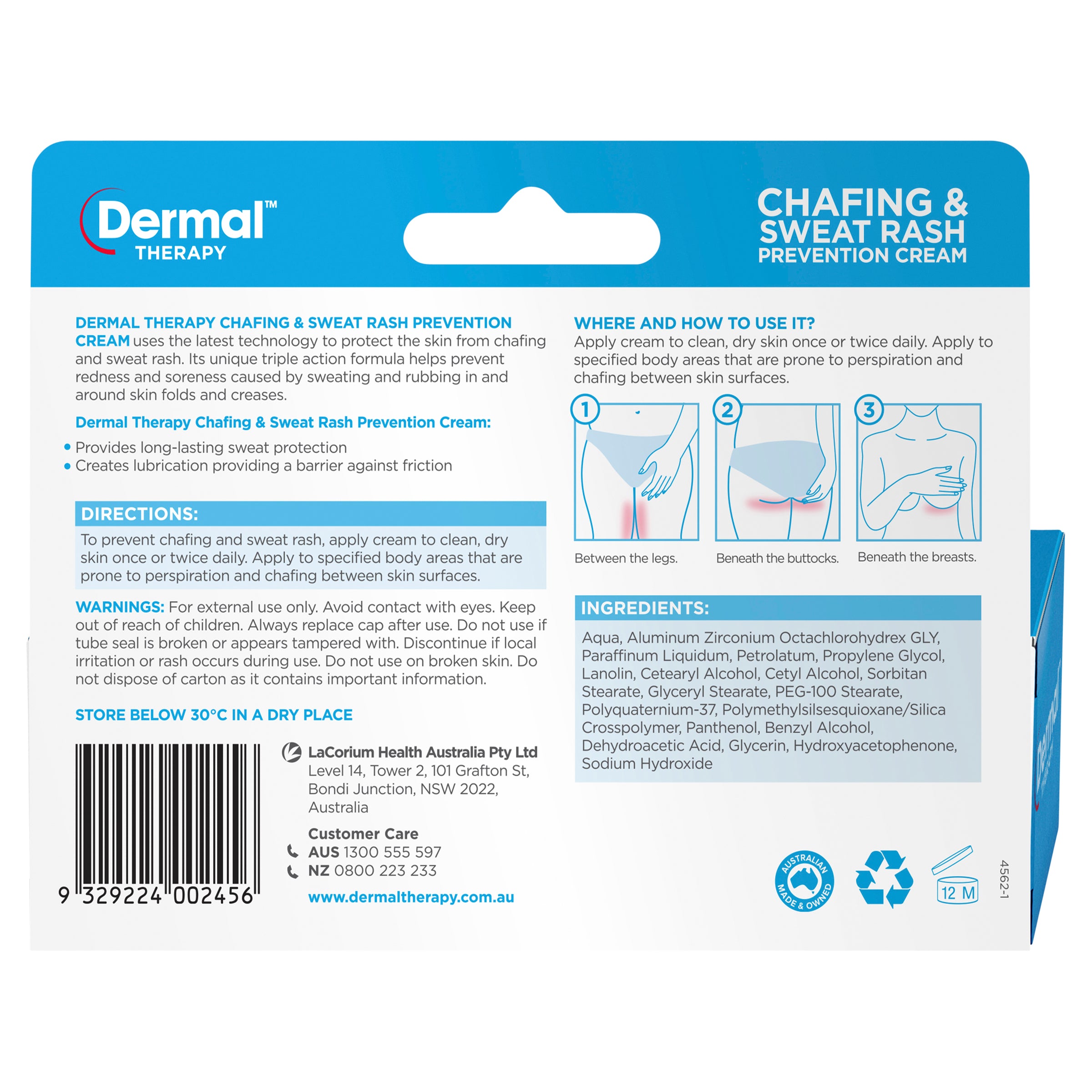 Dermal Therapy Chafing & Sweat Rash Prevention Cream uses the latest technology to protect the skin from chafing and sweat rash. Its unique triple action formula helps prevent redness and soreness caused by sweating and rubbing in and around skin folds and creases.