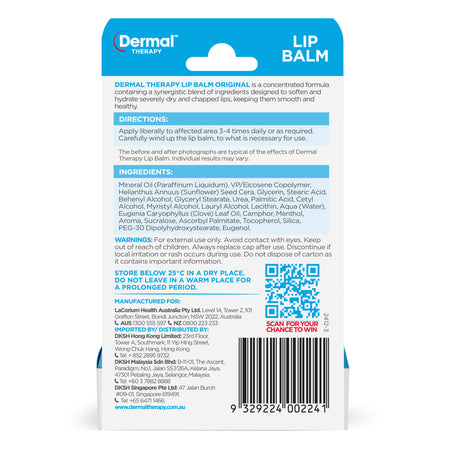 Dermal Therapy Lip Balm Original's concentrated formula is specially designed to hydrate and soften severely dry lips.