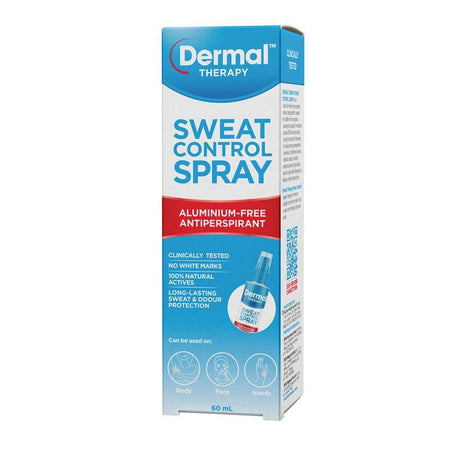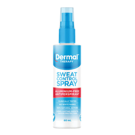 Dermal Therapy Sweat Control Spray is an aluminium-free antiperspirant formula designed for people who suffer from excessive sweating. Its unique formulation contains 100% natural actives, clinically tested to shrink pores and reduce heavy perspiration. It provides a high level of sweat protection and is clinically tested to provide long-lasting sweat & odour relief, leaving you feeling comfortable and dry.