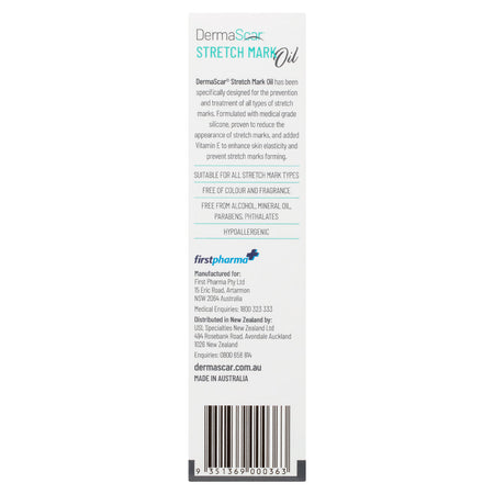 Dermascar Stretch Mark Oil has been specifically designed for the prevention and treatment of all types of stretch marks. Formulated with medical grade silicone, proven to reduce the appearance of stretch marks, and added Vitamin E to enhance skin elasticity and prevent stretch marks from forming. Suitable for all stretch mark types. Free from color and fragrance. Free from alcohol, mineral oil, parabens, and phthalates. Hypoallergenic.
