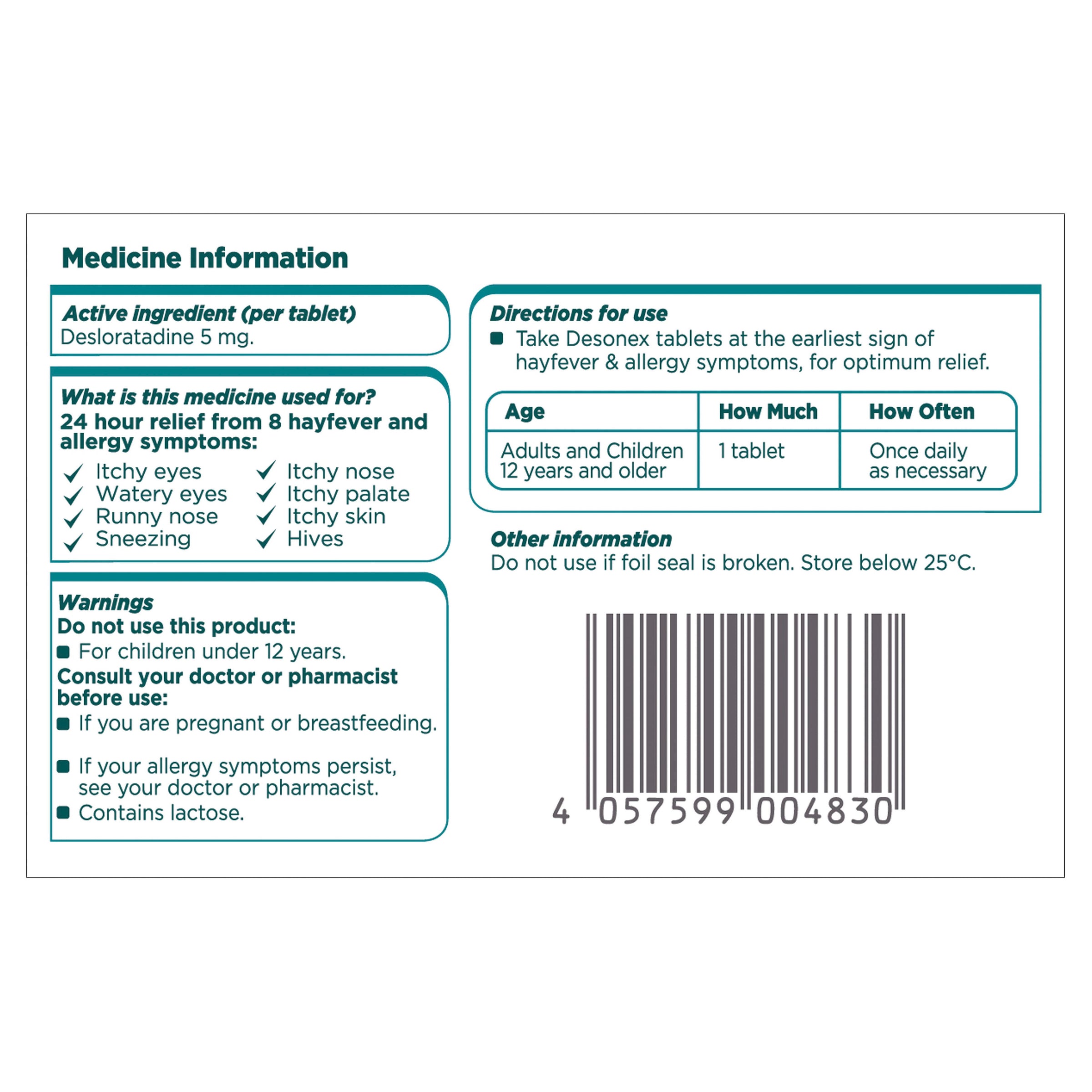 Desonex is a fast acting, non-drowsy antihistamine, that provides up to 24 hours of relief from allergy & hay fever symptoms. Just one tablet a day, relieves up to 9 allergy symptoms including: nasal congestion, itchy palate, runny nose, itchy nose, itchy eyes, watery eyes, sneezing, itchy skin and urticaria (hives).