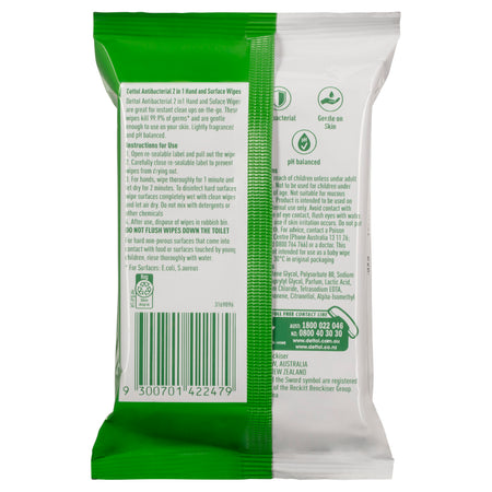 Dettol 2 in1 Anti-bacterial hand and surface wipes are great for instant clean ups on-the-go. With a mild fresh fragrance, these wipes kill 99.9% of germs (for surfaces: E. coli, Staphylococcus) and are gentle enough to use on your skin.