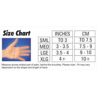 MEASURE ACROSS THE WIDEST PART OF THE PALM, BEHIND THE KNUCKLES.