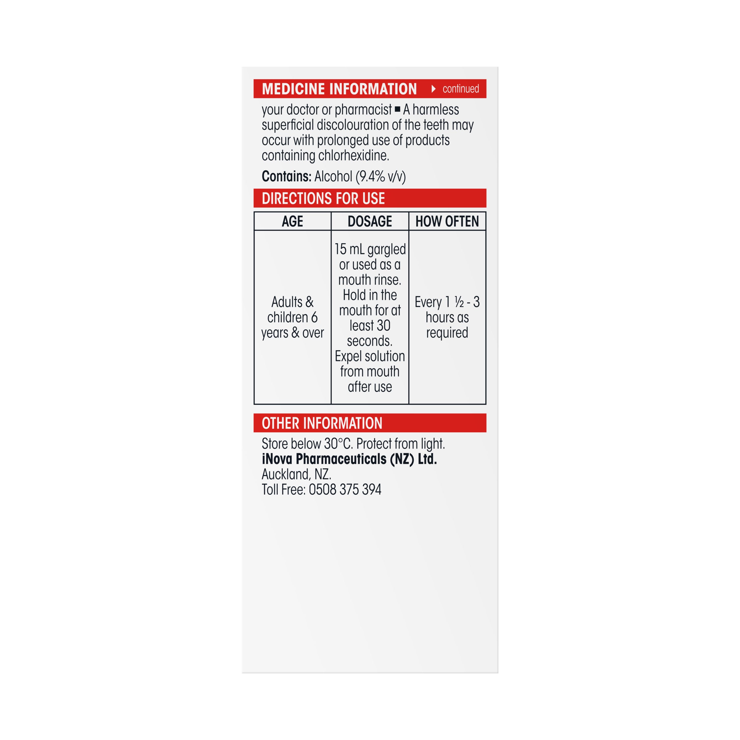 - 15ml to be gargled or used as a mouth rinse every 1 1/2 to 3 hours.