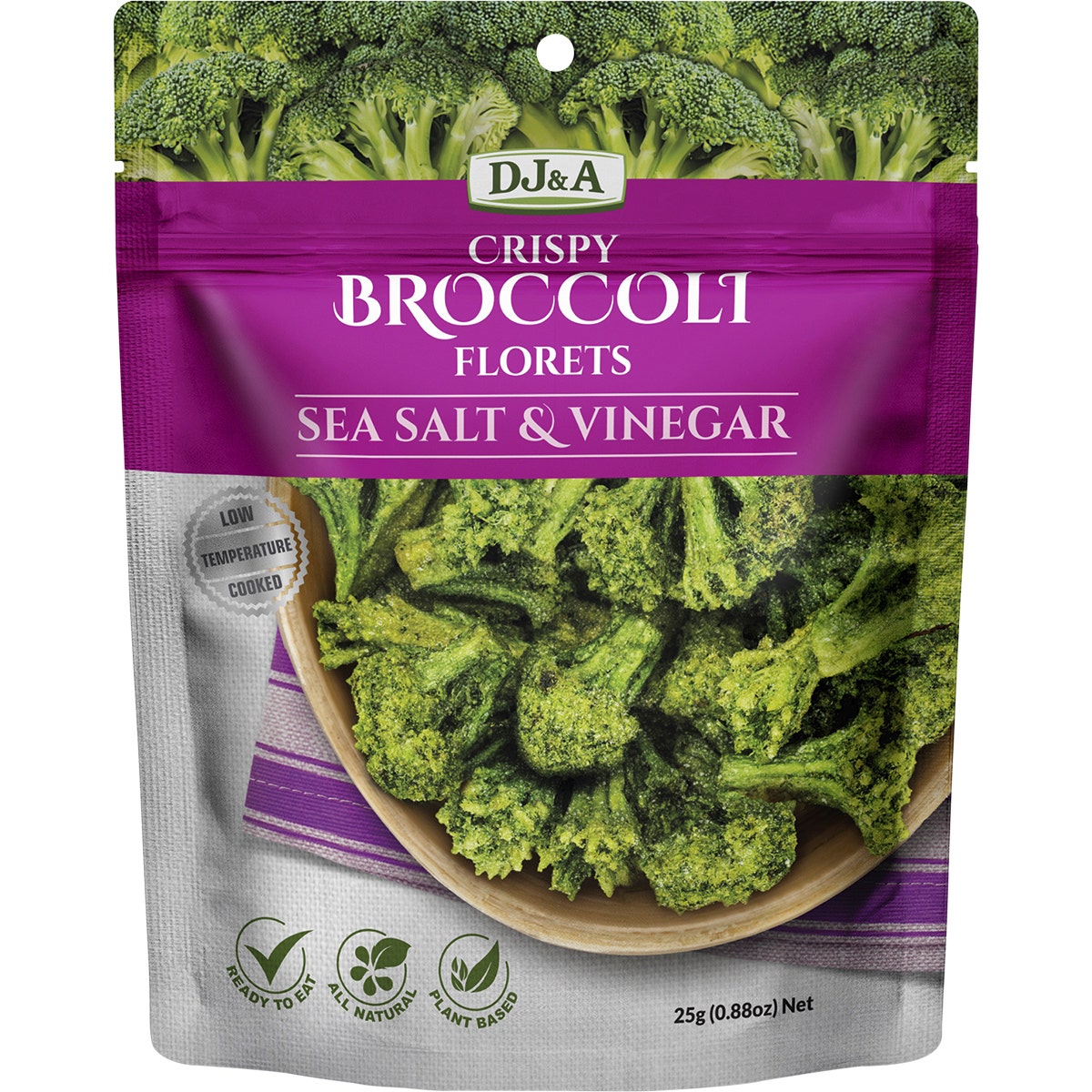Indulge in a crispy and flavorful snack with DJ&A's Crispy Broccoli Florets. Each 25g pack is seasoned with a perfect blend of sea salt and vinegar for a tantalizing taste. Made from real broccoli, this snack is a nutritious and delicious option for any time of the day.