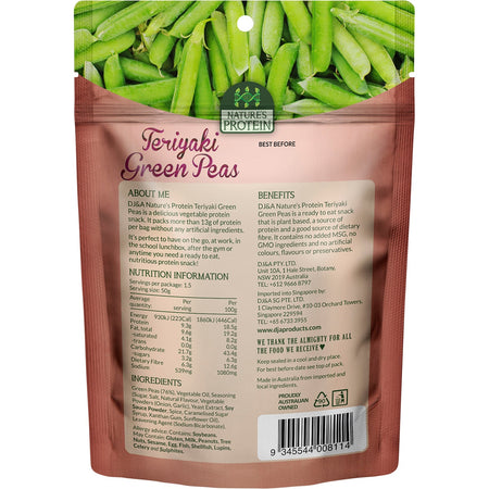Introducing DJ&A Nature's Protein Teriyaki Green Peas, a delicious and nutritious snack made with real green peas and a savory teriyaki flavor. Each 75g pack contains 12 servings, providing you with a protein-packed snack that will keep you satisfied and energized throughout the day. Try it now and taste the natural goodness of DJ&A!