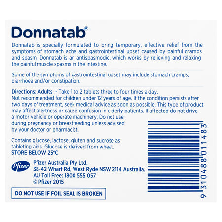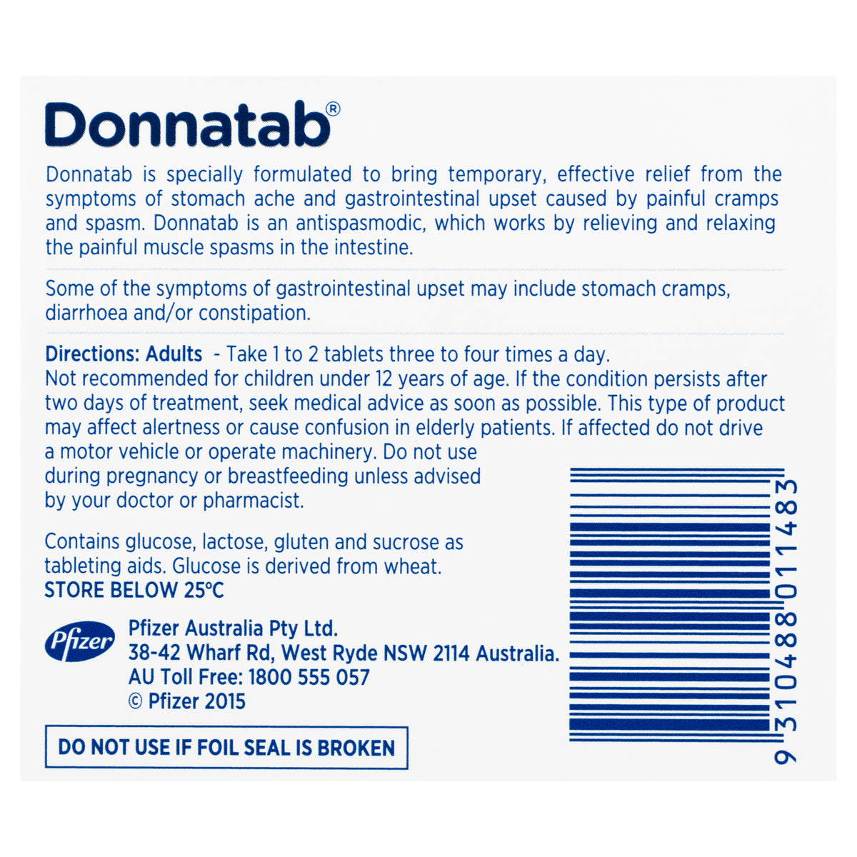 Donnatab is specially formulated to bring temporary, effective relief from the symptoms of stomach ache and gastrointestinal upset caused by painful cramps and spasm. Donnatab is an antispasmodic, which works by relieving and relaxing the painful muscle spasms in the intestine.Boxed Contents: 25 Tablets