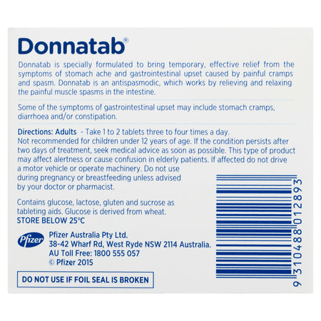 Donnatab is specially formulated to bring temporary, effective relief from the symptoms of stomach ache and gastrointestinal upset caused by painful cramps and spasm. Donnatab is an antispasmodic, which works by relieving and relaxing the painful muscle spasms in the intestine.Boxed Contents: 50 Pack