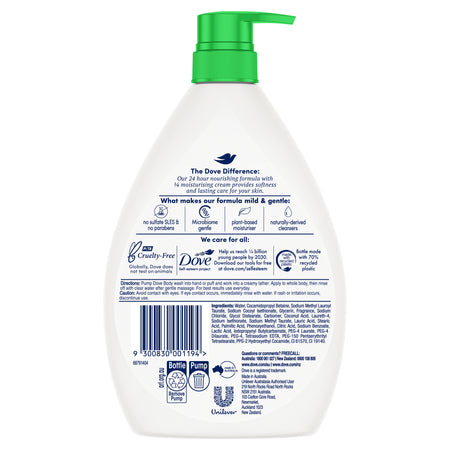 A refreshing shower is a great way to start your day off right, and a hydrating body wash can help you to nourish your skin at the same time. That's why we've created Dove Go Fresh Touch Nourishing Cucumber and Green Tea Body Wash, a nourishing body wash with a light, refreshing cucumber and green tea scent to give you a body wash that leaves your skin feeling fresh and hydrated. This mild body wash, with NutriumMoisture™ technology, combines gentle cleansers with skin natural nutrients to give you softer& smoother skin. And with Dove Go Fresh Touch Nourishing Cucumber and Green Tea Body Wash, all of that comes along with an uplifting scent to revitalize your senses and help kick-start your morning. Simply squeeze a generous amount of body wash onto your hands or a shower puff and enjoy the lather and refreshing scent before rinsing. Dove the home of real beauty. For over a decade, we've been working to make beauty a source of confidence, not anxiety. Dove celebrates a new definition of strength: one with care at its centre. Real strength is shown through the care you give to the people that matter - and that includes you. Whether you're looking for a deodorant to keep you feeling fresh and dry all day or you want a body wash to help keep your skin hydrated, Dove products are designed to protect and care for your skin.Boxed Contents: 1L