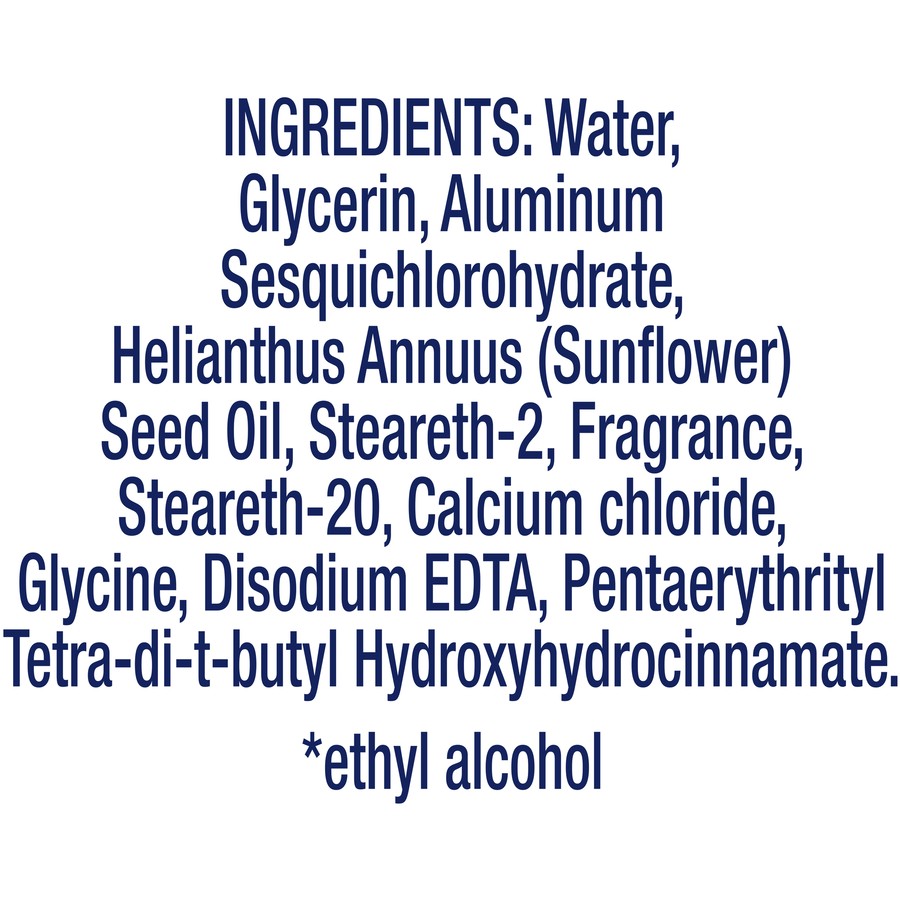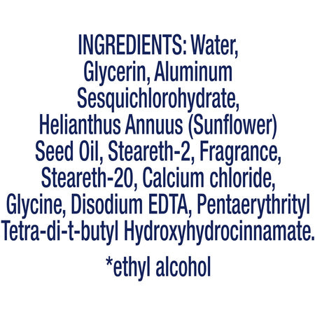 Water, Glycerin, Aluminum Sesquichlorohydrate, Helianthus Annuus (Sunflower) Seed Oil, Steareth-2, Fragrance, Steareth-20, Calcium Chloride, Glycine, Disodium EDTA, Pentaerythrityl Tetra-di-t-butyl Hydroxyhydrocinnamate.