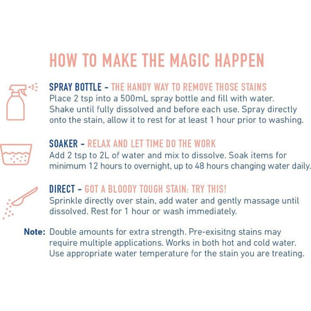 Spray bottle: Place 2 tsp into a 500ml spray bottle and fill with water. Shake until fully dissolved and before each use. Spray directly onto the stain, allow to rest for at least 1 hour prior to washing