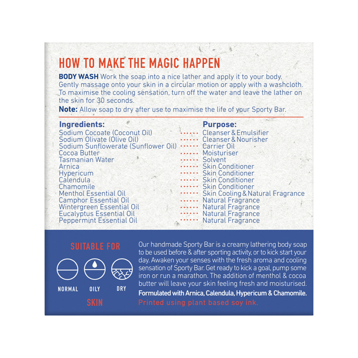 Our handmade Sporty Bar is a creamy lathering body soap to be used before & after sporting activity, or to kick start your day. Awaken your senses and your body with the fresh aroma and cooling sensation of Sporty Bar. Get ready to kick a goal, pump some iron or run a marathon.