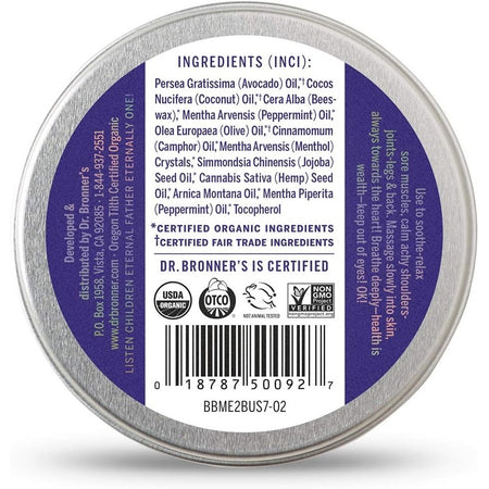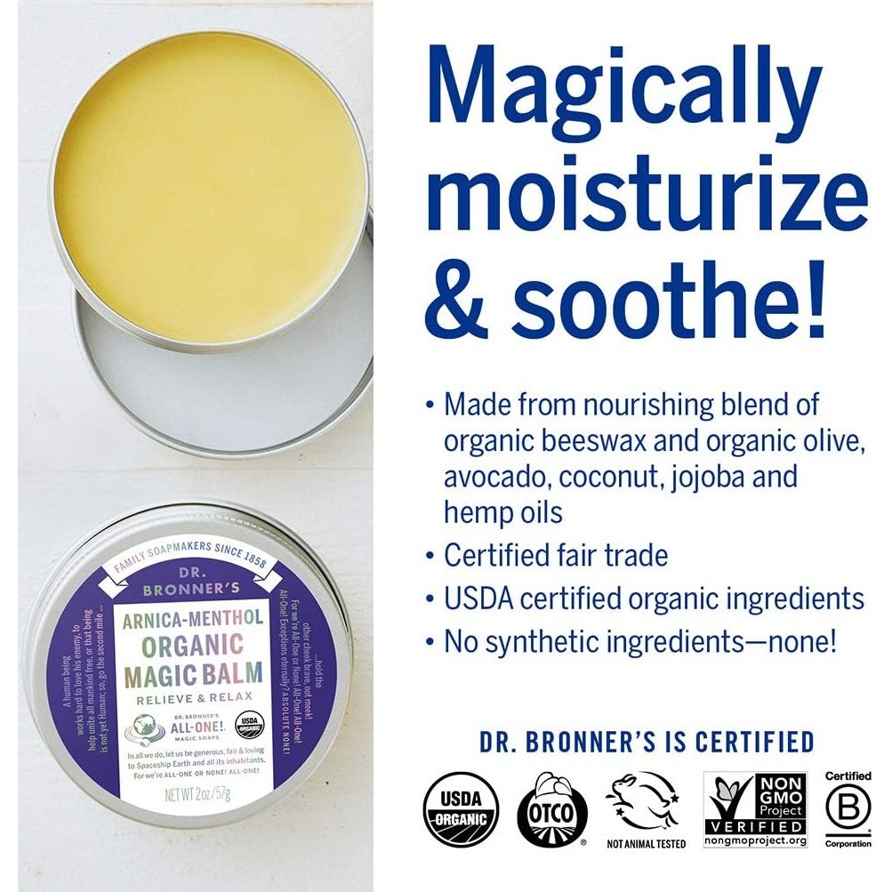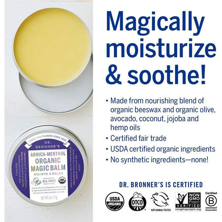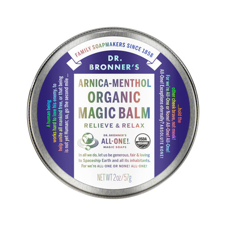 Dr. Bronner’s Arnica-Menthol Organic Magic Balm helps cool and soothe sore muscles and achy joints with a potent blend of arnica, camphor, menthol and peppermint oils. Our base of organic beeswax and organic oils – avocado, coconut, olive, jojoba and hemp – nourish and moisturise skin with no synthetic ingredients – none!