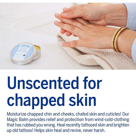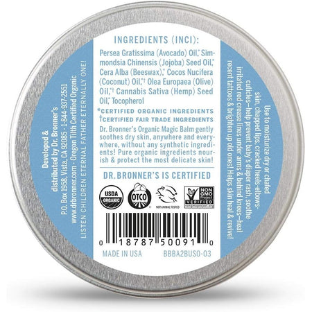 Dr. Bronner's Baby Unscented Organic Magic Balm provides instant relief for dry skin. Soothe skin safely and simply – no synthetic ingredients – certified to the same National Organic Program that certifies food. Made from a soothing blend of organic beeswax, organic coconut, organic avocado oil, organic jojoba oil and organic hemp oil.