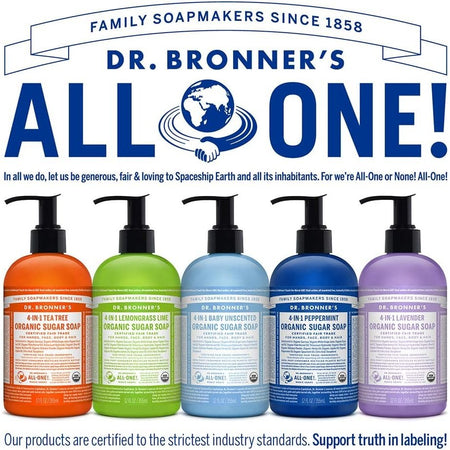 4-in-1 Organic Pump Soaps are good for washing hands, face, body & hair – place by your sink or in the shower! To wash hair work one pump of Organic Pump Soap into wet hair until it lathers, then rub and rinse. Repeat for thicker or longer hair. After washing, follow up with a lightly acidic conditioning rinse, like Dr. Bronner’s Citrus Organic Hair Rinse to leave hair silky smooth! Don’t have the Organic Hair Rinse? Use diluted apple cider vinegar or lemon juice!